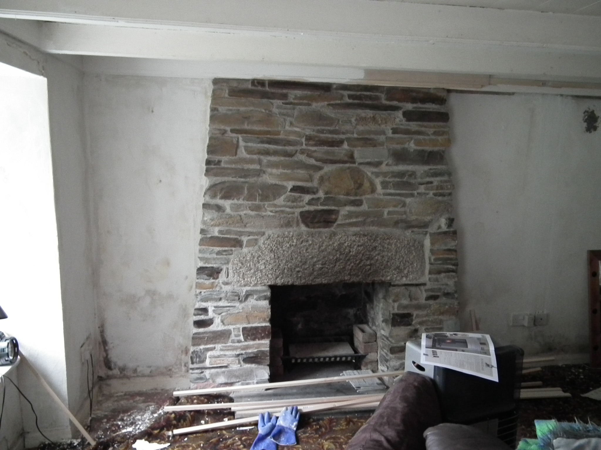 When we moved to Millbrook Cottage, there was a low fireplace with a kind of slate mock-chimney effect built up the wall – 1970s style, we thought. Not only did this make little of the superb piece of granite embedded in the design, but the fireplace didn’t function – there was no space for the fire to draw. We needed a bigger, better-looking fireplace. So we cracked on with it – literally!