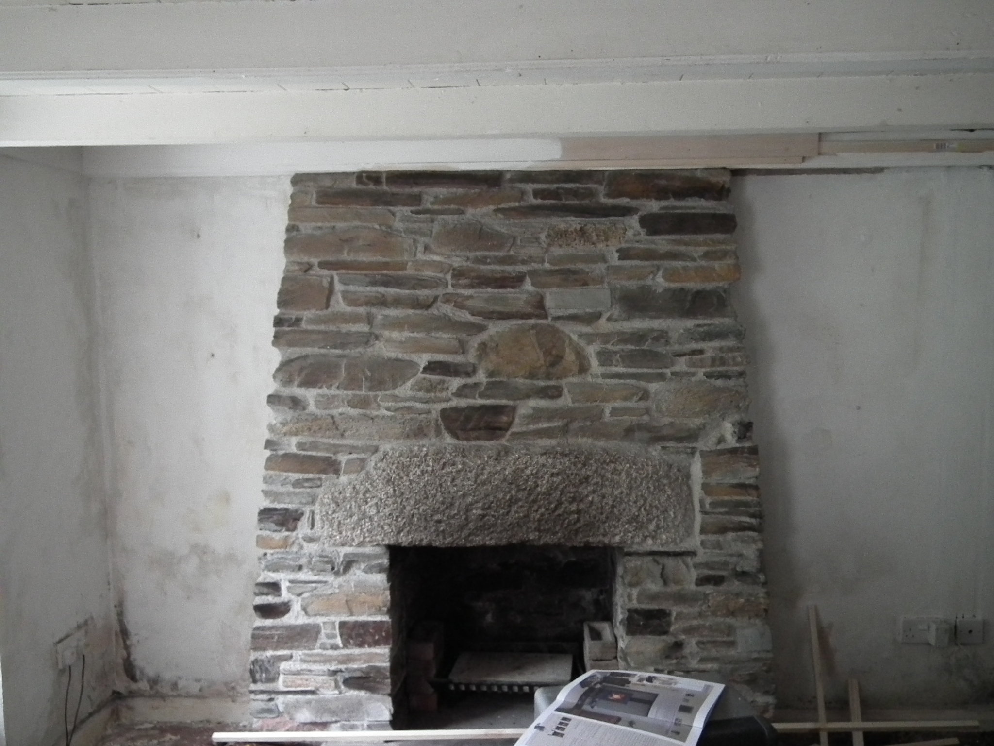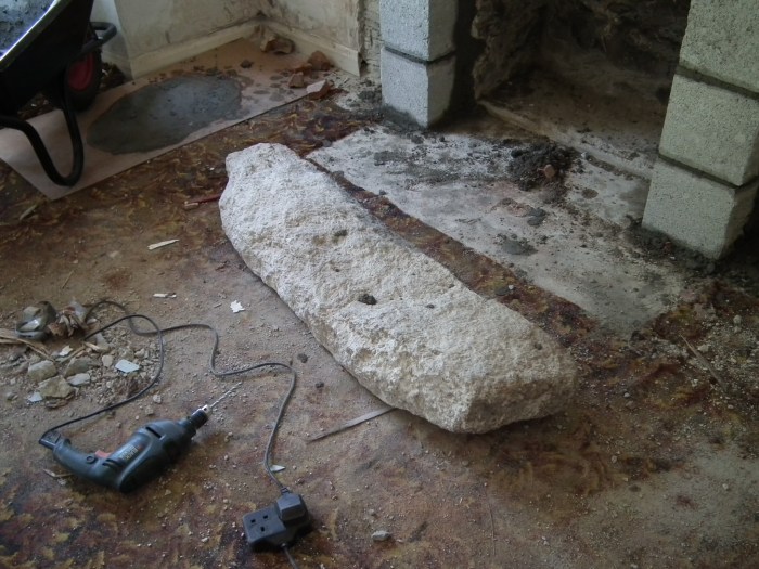 We smashed the old thing to pieces so for a while there was rubble all over the front room floor. Once this had been demolished (saving the prize granite lintel), the first job was to create the two pillar sides – built by erecting and cementing concrete blocks either side of the fireplace. The next job was to lift the huge lintel – the main feature – up on to these two pillars. Back-breaking but three of us hoisted it up by ‘walking it’ on to concrete blocks: one block at a time, one end at a time, until we had it at the right height. It was then placed on top of the newly-built pillars above the fireplace to form this wonderful mantelpiece. Lastly, we laid a slate floor, using bits of slate from the garden and leftover slate tiles from another job.